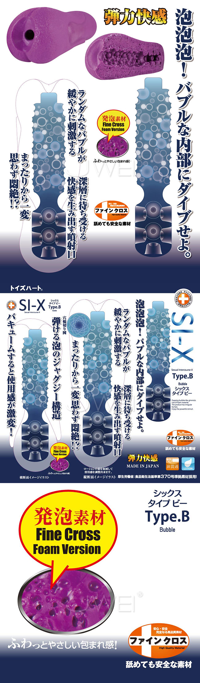 弾ける泡のジャグジー構造が、まったりから一変思わず悶絶する弾力快感。 なんともいえない発泡素材と、ランダムに設けられたバブル状の突起構造は、一瞬まったり系なのかと思わせておいて、なかなかの刺激を楽しめる一品。 また、最奥部付近には噴射口のような突起が施されているので、コリコリ刺激も。 バキュームすると使用感が激変する人気のシリーズオナホ「シックス」の新作です。