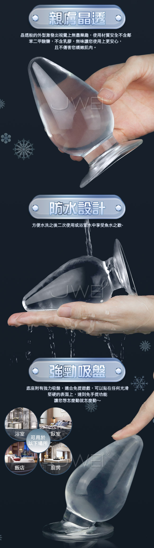 LOVETOY無恥透明冰雪無暇系列幫助您發現新性愛世界!採用親膚安全的透明材質提供給愛侶們的全新選擇激發出令人興奮的可能性和無盡的樂趣。此款棒身錐形尖端與窄脖子設計,填滿您的後庭小穴給您大大的滿足感。底座附有強力吸盤,適合免提遊戲,可以貼在任何光滑 堅硬的表面上,達到免手提功能讓您想怎麼動就怎麼動~