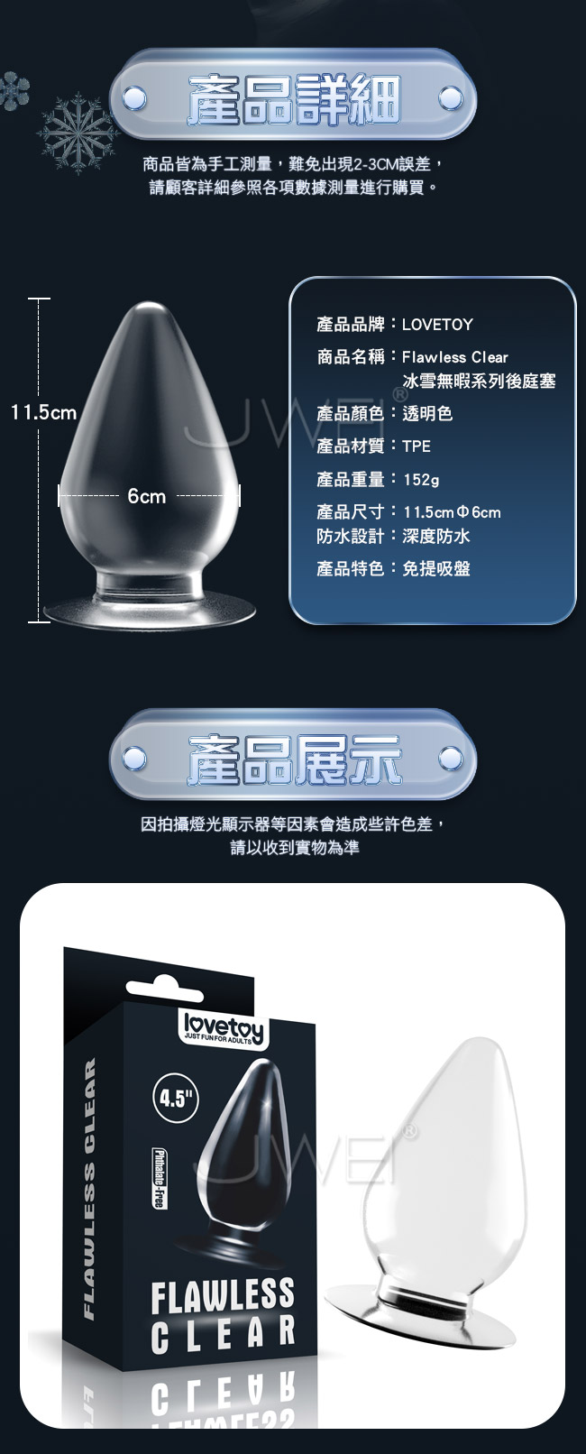 ►您現在的位置:首頁> Lovetoy.Flawless Clear冰雪無暇系列 Anal Plug透明後庭塞-4.5吋
