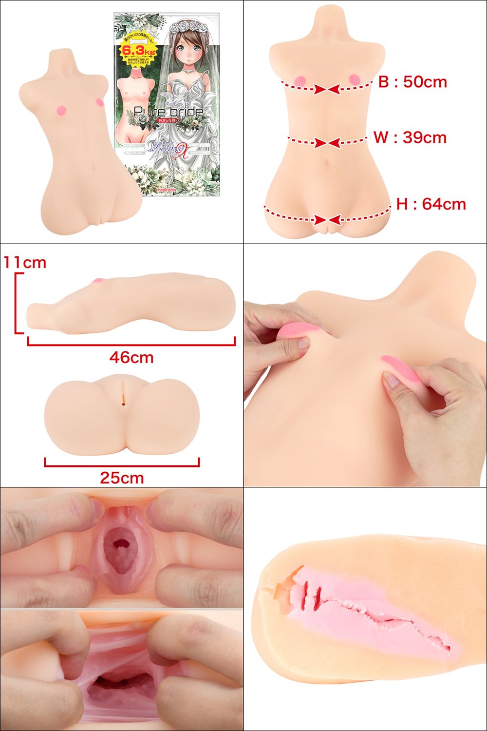 ピュアブライドろりんこが肉感アップしてリニューアル!スリムで扱い易い全長46cm5.5kgからサイズはそのまま簡易骨格にすることで6.3kgとボリュームアップを実現!侵入部のすじまんと純潔膜も含めたボディはまさに理想(イデア)な造形、美しいスジの奥に眠る純潔地帯はギチギチに包み込みウェーブ上の肉壁でプレスされ最深部の15cmまでにあなたを絞りとります。とてもカワイイ微乳ボディのろりんこは様々にプレイにも対応しており普段緊張気味でもお風呂場に行けば大胆になるかも!?