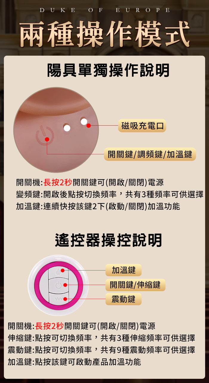 ►您現在的位置:首頁>歐洲公爵 ‧ 無線遙控抽送撞擊 液態矽膠超肉感逼真大老二﹝強勁蠕動伸縮震動+加溫+吸盤+磁吸充電﹞