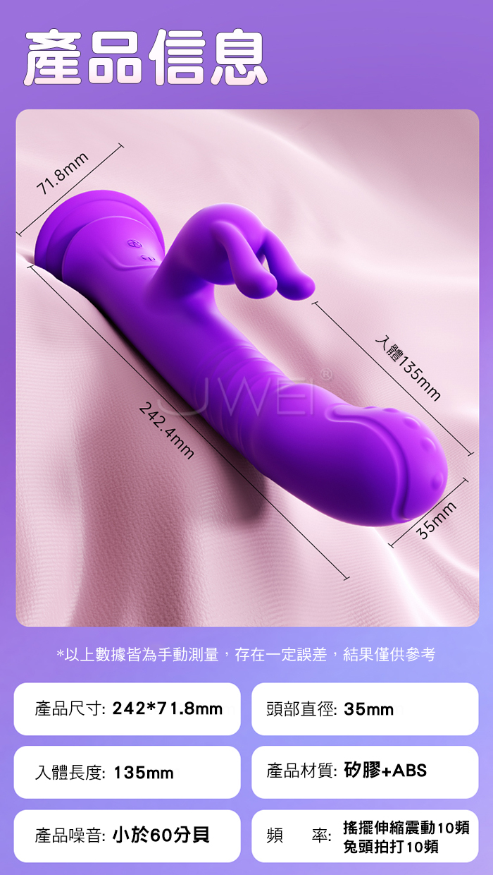 ■功能: 10頻搖擺伸縮震動,10頻兔頭拍打