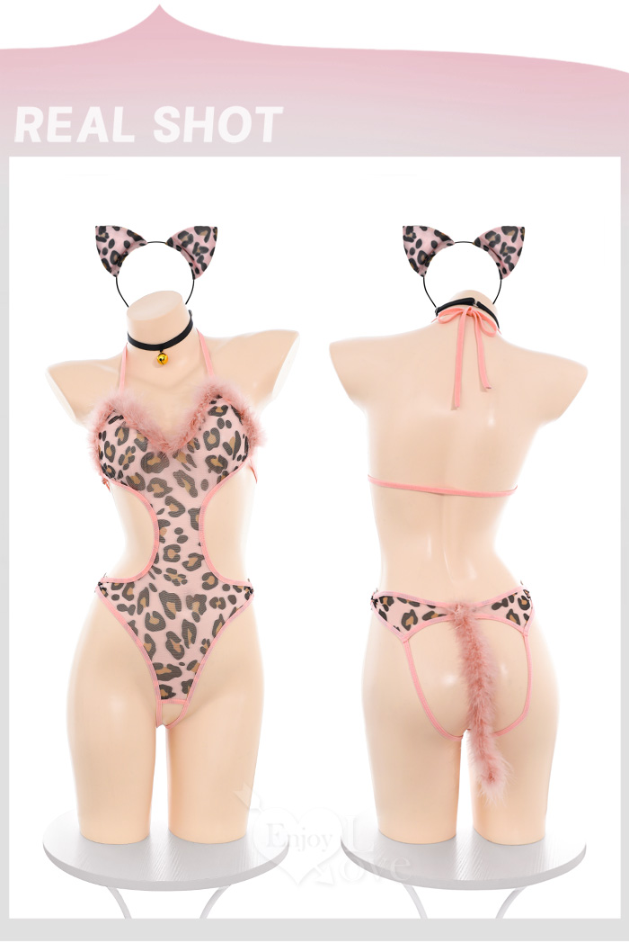 貓咪角色扮演服!粉紅豹紋毛絨飾胸鏤腰露臀開襠連身衣三件組