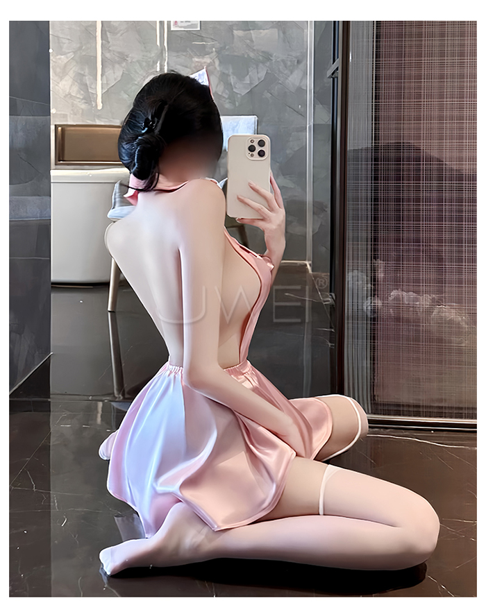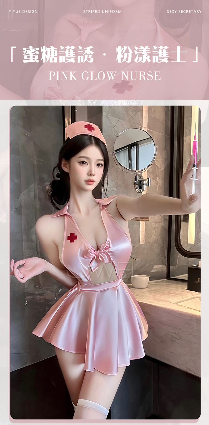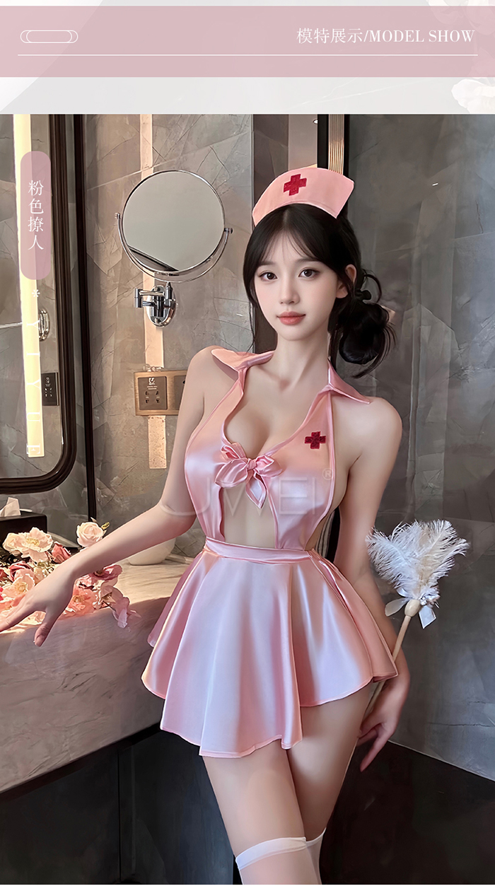 ►您現在的位置:首頁>蜜糖護誘.粉嫩甜美深V露溝高腰短百褶裙擺護士裝【髮箍+洋裝+T褲】