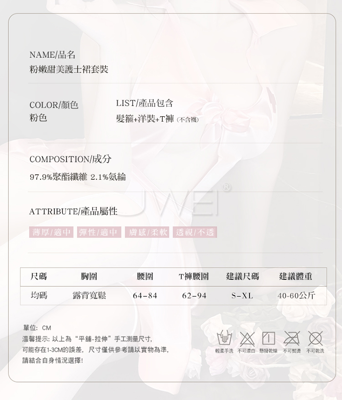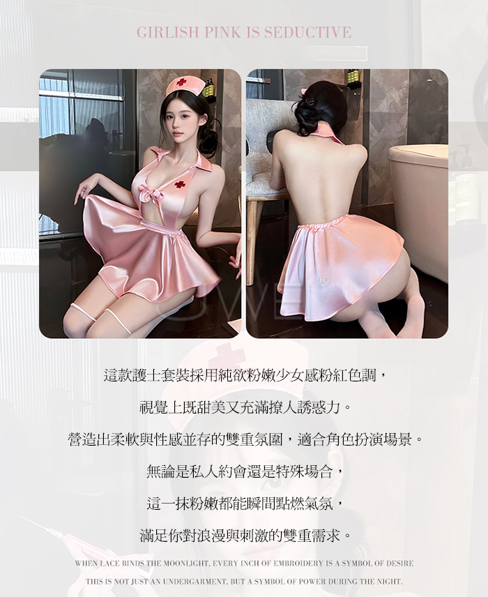 | 蜜糖護誘.粉嫩甜美深V露溝高腰短百褶裙擺護士裝【髮箍+洋裝+T褲】