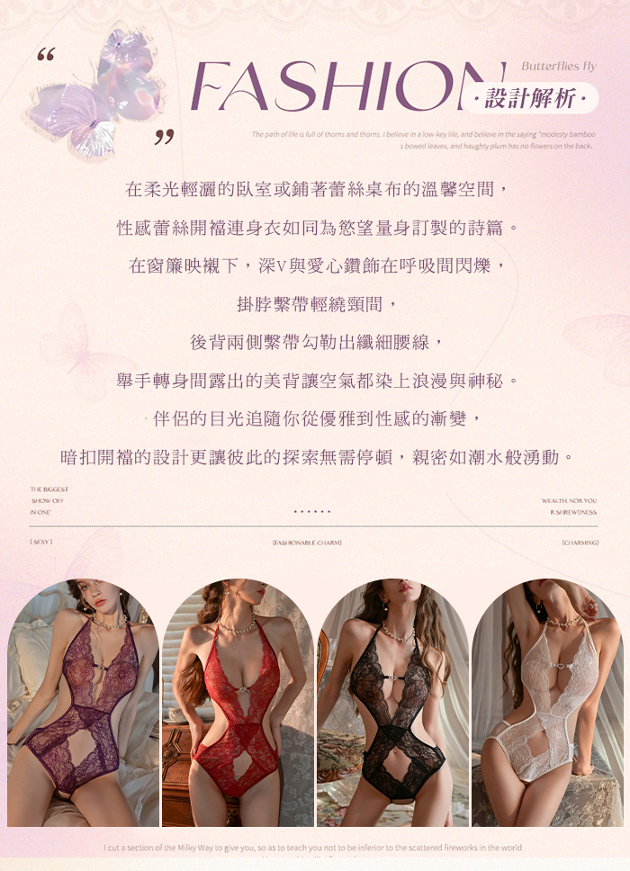 繁花似錦.深V愛心鑽飾露胸掛脖繫帶美背蕾絲開襠連體衣【黑色】
