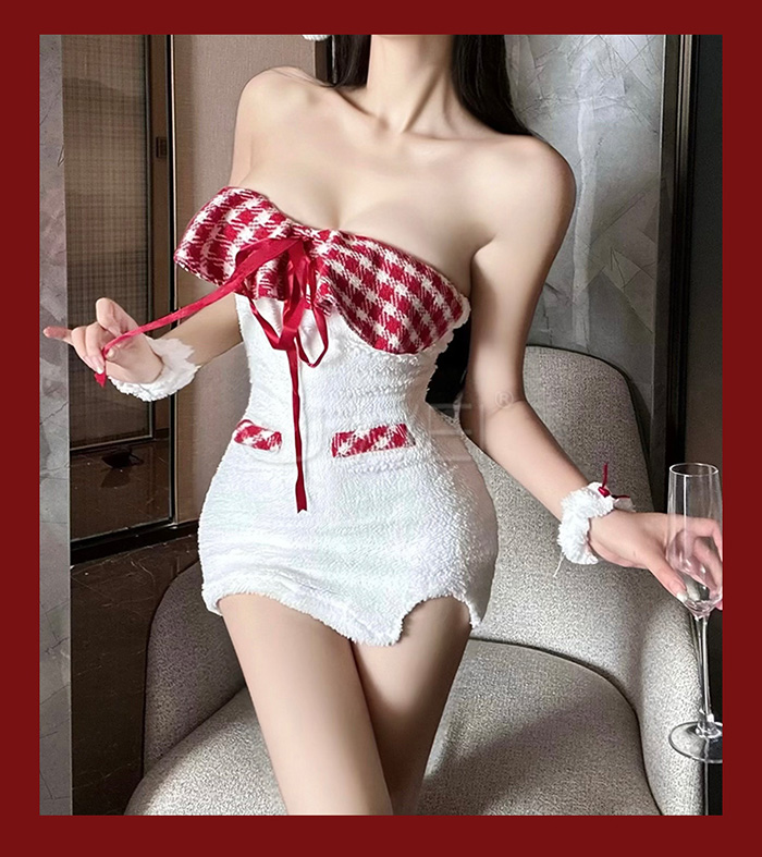 | 夢夜覆雪.紅白格紋平口裹胸白色毛絨修身包臀連身裙套裝【帽子+連身裙+手環】