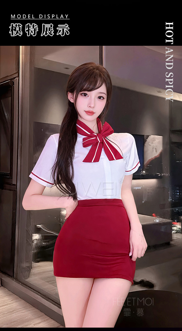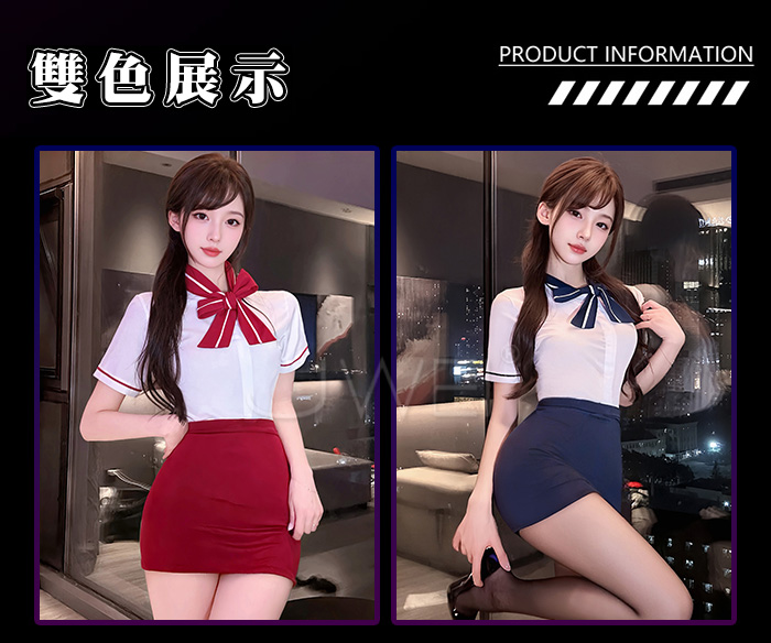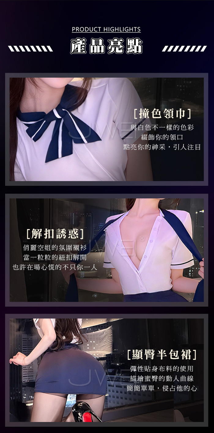 首頁>雲端心機.解扣露溝誘惑修身貼合顯臀禁慾空姐套裝【上衣+裙子+T褲-藍】