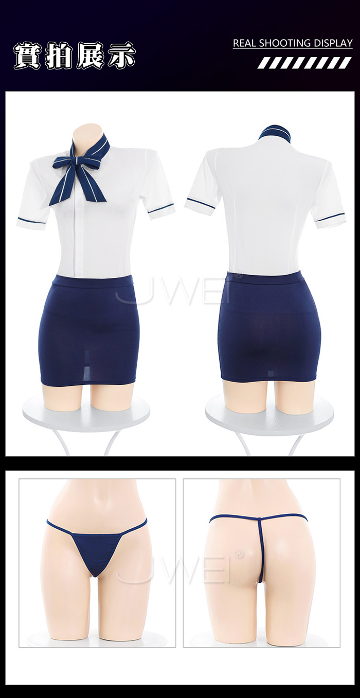 雲端心機.解扣露溝誘惑修身貼合顯臀禁慾空姐套裝【上衣+裙子+T褲-藍】
