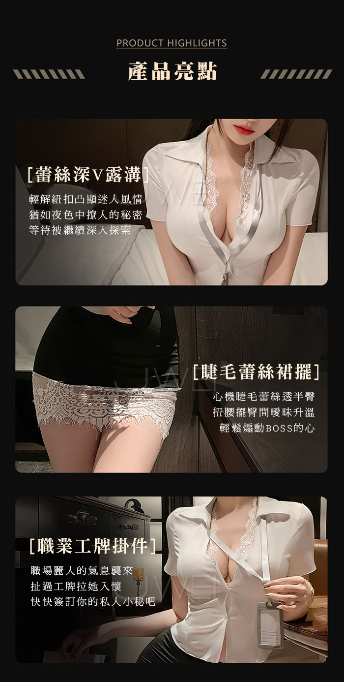 ►您現在的位置:首頁>秘書情事.深V露溝睫毛蕾絲包臀裙襬秘書套裝【上衣+工牌+包臀裙+T褲】