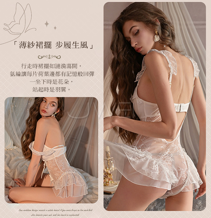 慾情薔薇.蕾絲深V美肩露背花蔓透紗開襠連體衣【白色】